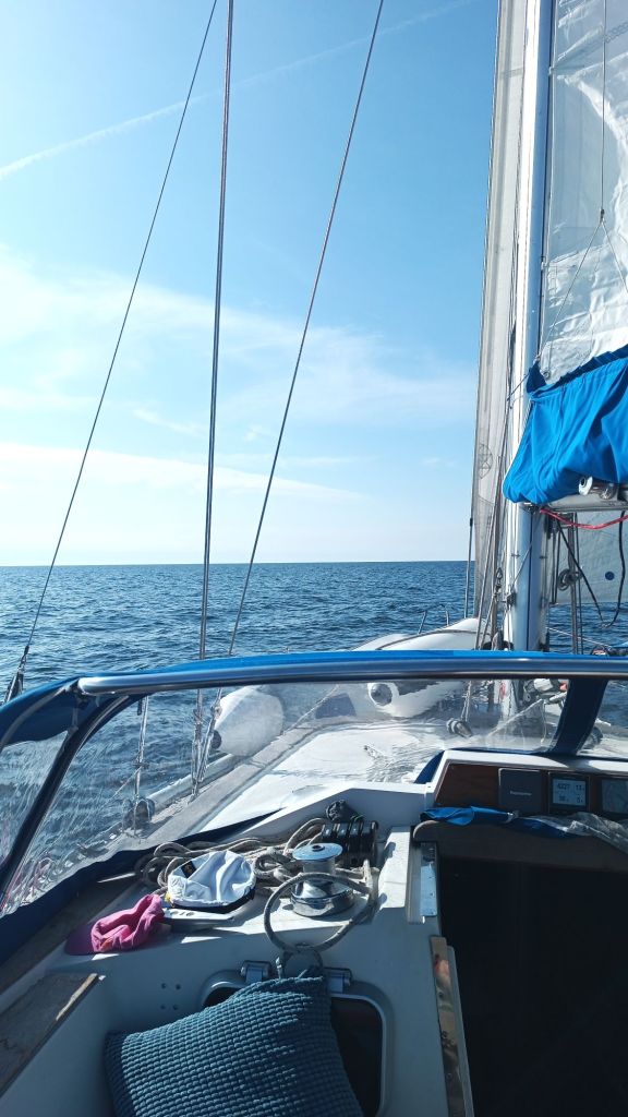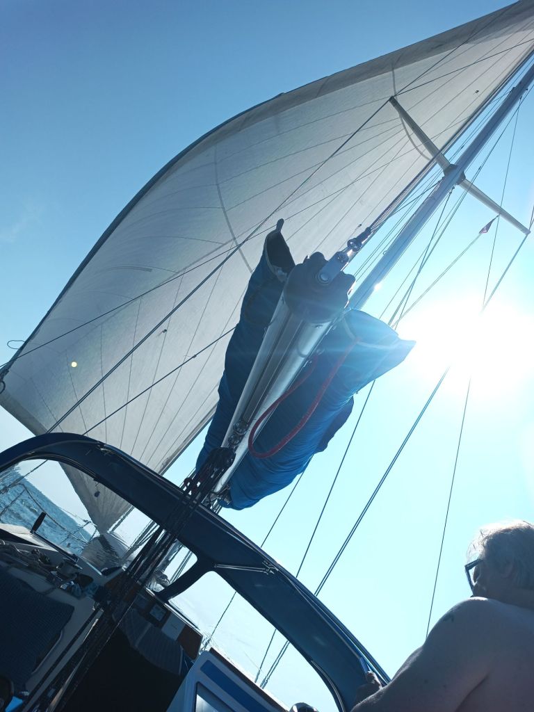Tuuli nousi hiljalleen, ja kun nostimme purjeet, kulku oli sulavaa. Mutta hetken päästä meri tyyntyi – niinpä jatkoimme koneella pari tuntia.