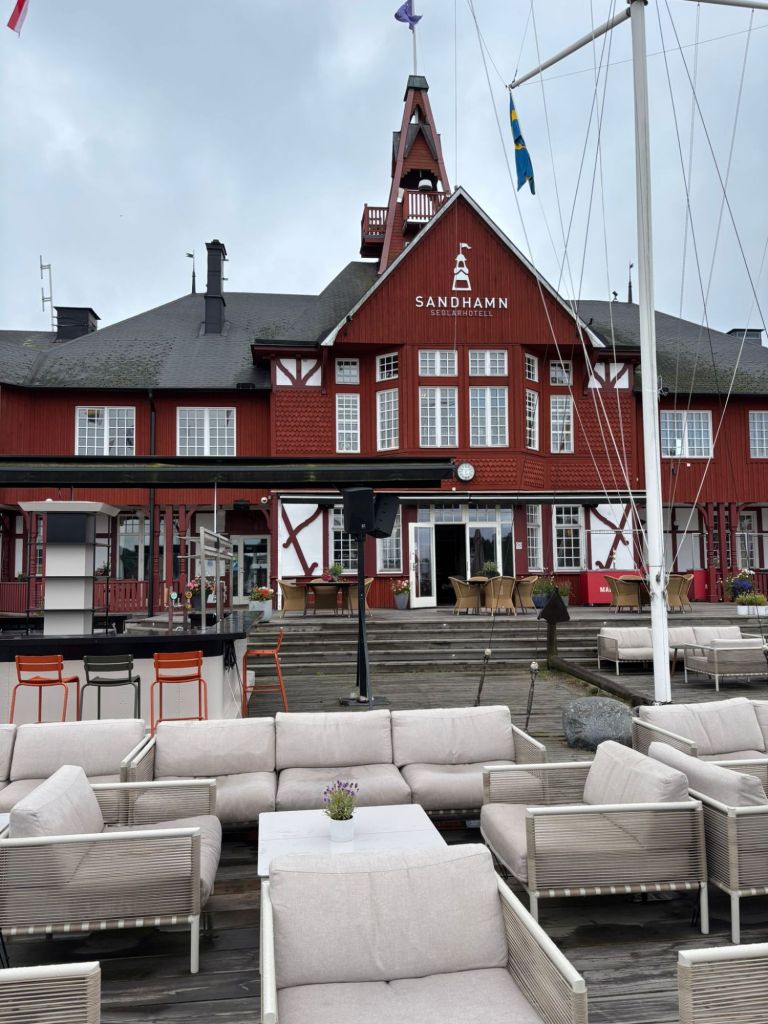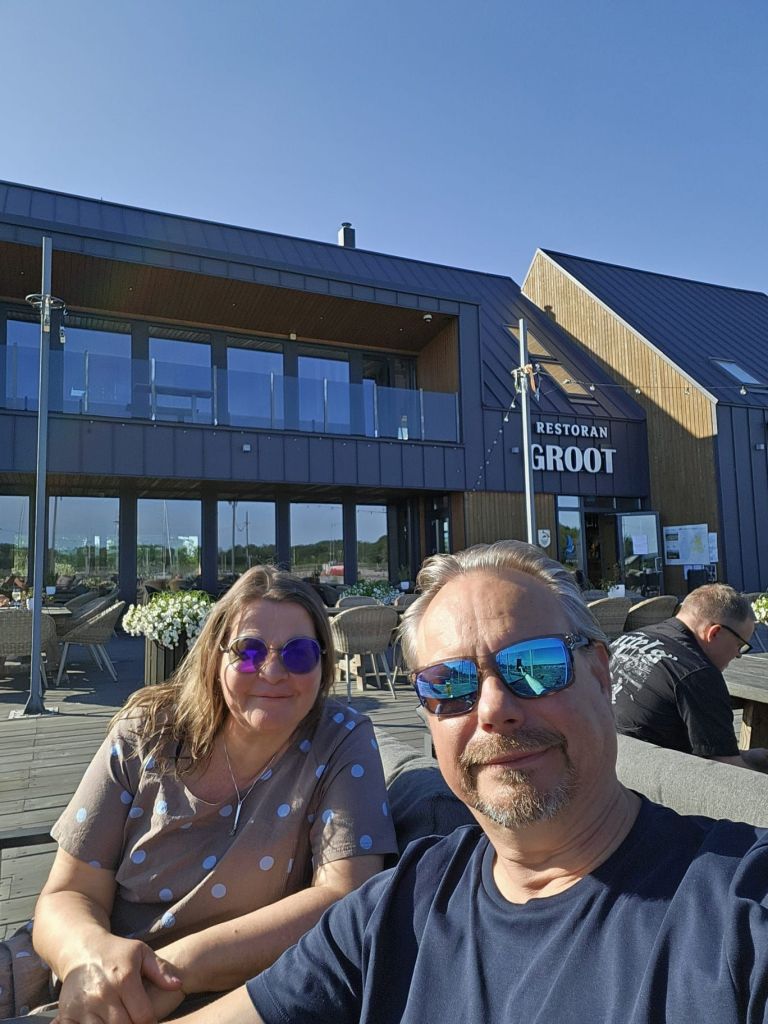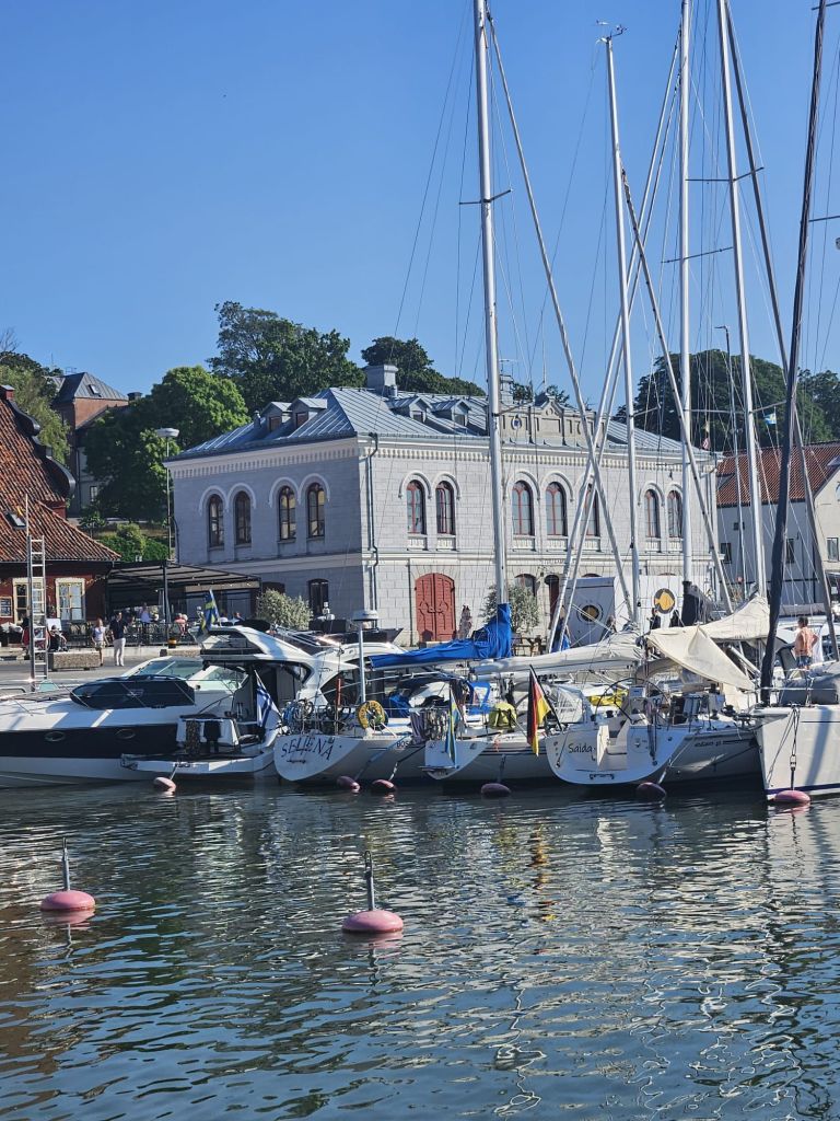 Landausoluet ja puolijuoksulla keskustaan syömään. Ensimmäisestä ravintolasta ei paikkaa, mutta seuraavasta löytyi viileä terassi. Onneksi oli nutut yllä, pitkät lahkeet jne – muuten olisi tullut vilu . Skroderkrogs tarjosi erinomaista ruokaa. Paluu veneelle Boltilla, lämppäri päälle ja lasi punaviiniä käteen. Elämän pientä luksuksia.