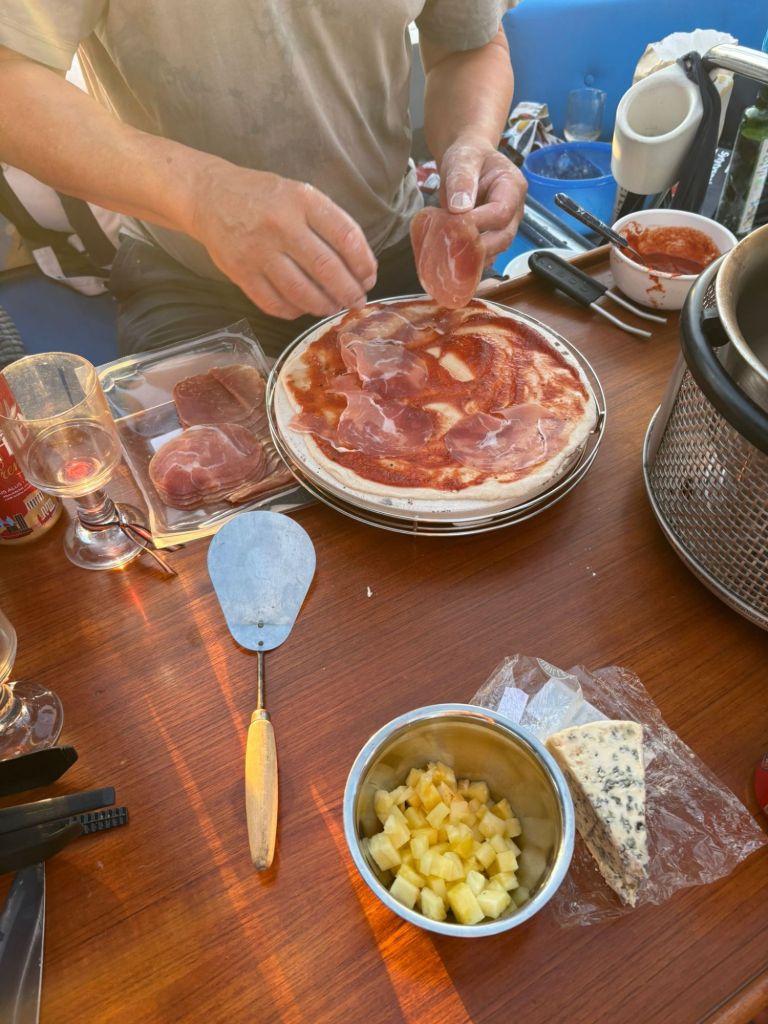 Päivällä nautimme pizzaa kaupungilla, illalla veneessä valmistui tortilloja ja pidimme leffaillan. Tunnelma oli kotoisa ja rauhallinen, kunnes ilta toi yllätyksen.