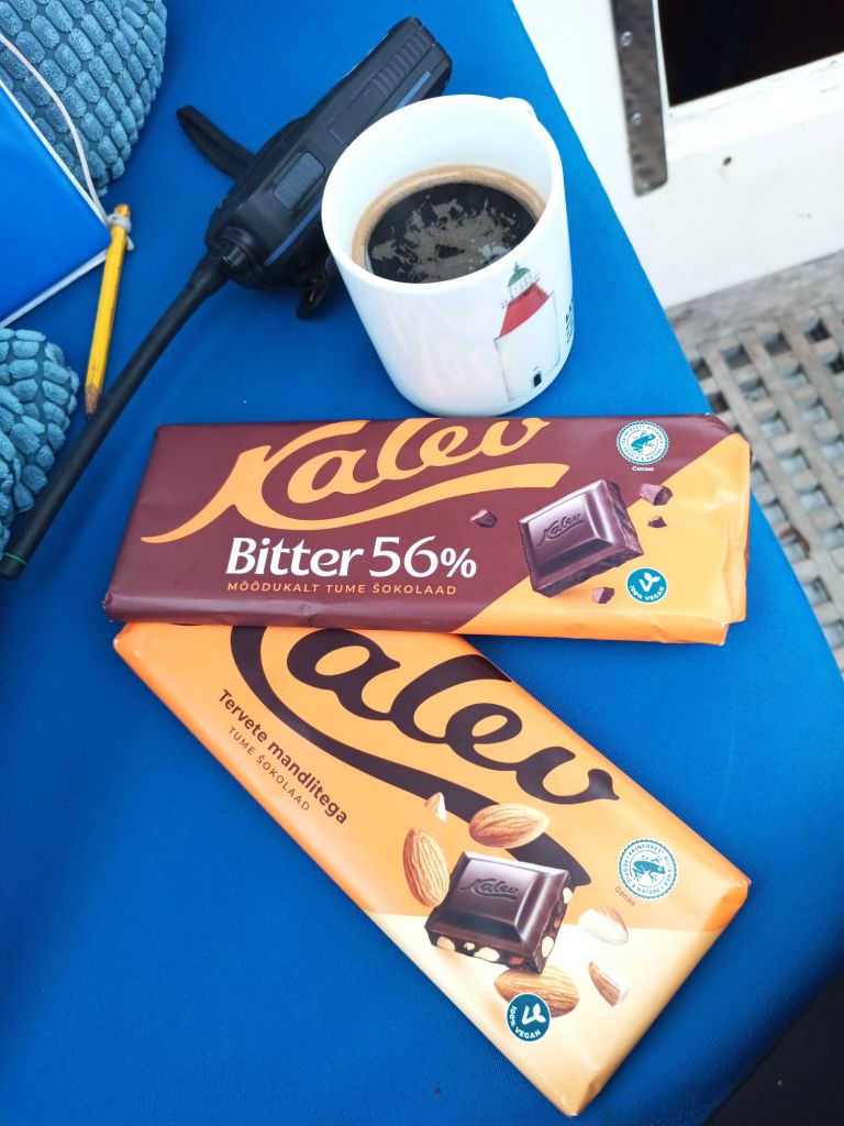 Taaskin saunavuoro osui illan viimeiseksi, ja niinpä hoidimme siivoukset, vesiastiat ja muut valmiiksi seuraaville jo saunavuoron päätteeksi. Aamuherätyksen jälkeen tarkoitus oli nousta merelle heti – edessä oli avomeripurjehdusta.
