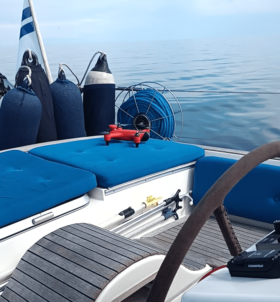 Aamulla lähtö tyynelle Riianlahdelle, konemarssia. Tehtiin pieniä huoltohommia, teippailtiin vantteja ja viimeisteltiin säädöt. Kaunista ja kesäistä, voi olla ilman paitaa. Petri halusi lennättää dronea ja nyt historia toisti itseään. Pieni törmäys ja brics! kameran suojalasi rikki. Kuvia saimme tasan nolla! Uusia suojalaseja olisi kotona, laatikossa. Kätevää!