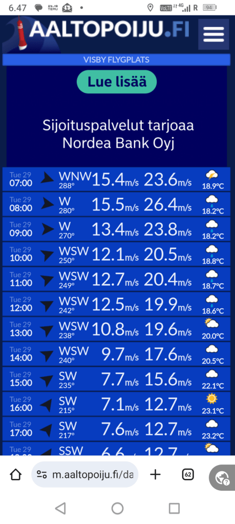 Gotlannin yli edennyt tuuli ja sade pyyhkäisi maanantain ja tiistain välisenä yönä. Puuskissa tuuli nousi yli 26 m/s. Onneksi meillä oli satamasta erinomainen paikka – keula suoraan tuuleen ja nurkassa satama-altaassa. Kaikilla ei ollut näin hyvin. Satamassa oli melkoista keinuntaa ja yllättävästi myös tuuli vihmoi laitureissa. Osassa veneistä oltiin hereillä ihan pakosti. Pääsin taas ihmettelemään myös sitä miksi ihmiset käyttää skuuttiköysiä kiinnitysköysinä😳. Vastapäätä meitä ollut 47,7-jalkainen purjevene veti aamuyöstä köyden altaan yli ja toisen sivusta laituriin. Molemmat näistä skuuttiköysiä. Myös kaikki muut heidän köydet oli skuuttiköysiä. Käsittämätöntä, eikö kaikki sitten välitä vai yksinkertaisesti vain tiedä köysien eroista. Jos Selenan kiinnittäisi ilman joustimia olisi meno veneessä melko tökkimistä, ihan mahdotonta siis.