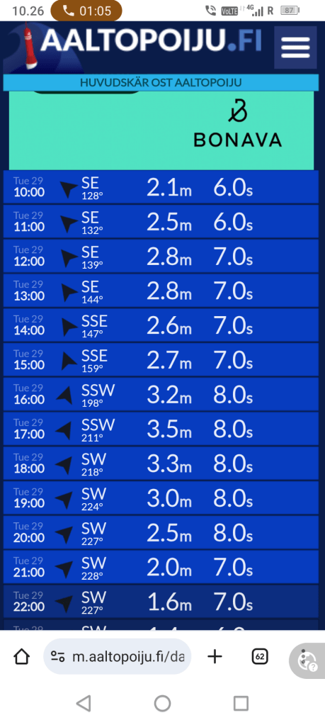 Loman tokavika päivä Rödhamnissa valkeni tuulisena ja kansi oli märkä yön sateista. Ilma oli kuitenkin kirkastumassa. Tuuli oli noussut jo aamuyöstä ja sai maston laulamaan, vaikka olimme saaren suojan puolella. Usein tuo maston humina antaa vaikutelman kovemmasta tuulesta kuin todellisuudessa on – niin nytkin. Windyn ennustama etelän suuntainen “vihreä tuuli” ylittyi vain hetkittäin koko päivän aikana.