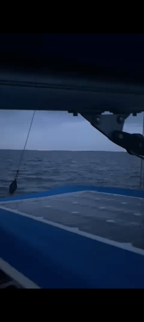 Ennen nukkumaanmenoa maston köydet alkoivat hakata tuulessa – ne olivat jääneet päivällä vähän löysälle. Kiipesimme kannelle niitä kiristämään ja samalla näimme lähestyvän tumman ukkosrintaman nousevan taivaalle.