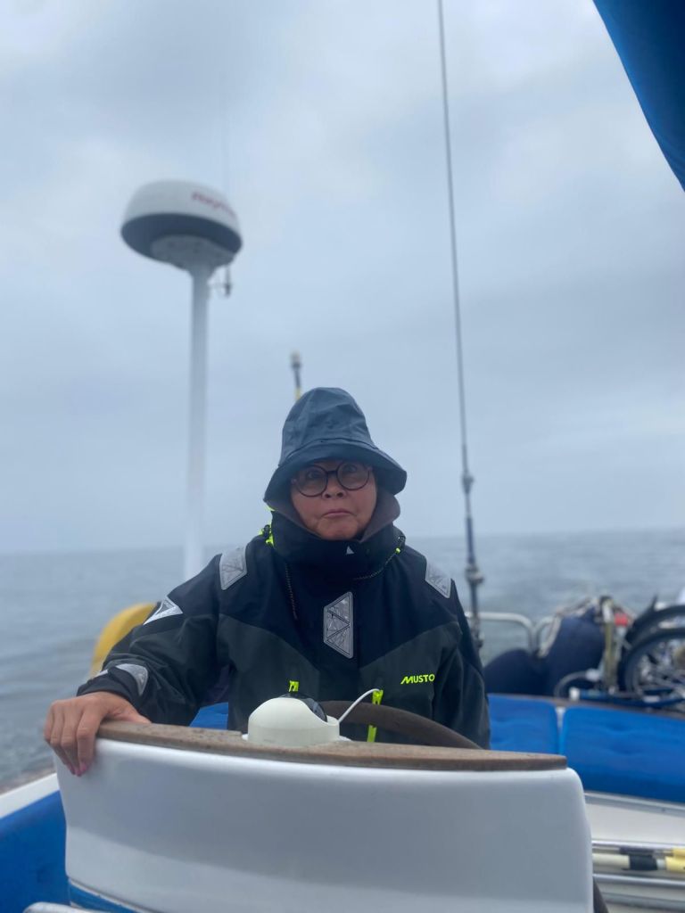 Kuluu neljä tuntia sumussa seilaten, tutkaa tuijottaen. Olimme suurimman osan ajasta verkossa niin pystyin seuraamaan laivoja Marine Traficin avulla. Ei piukkoja ohituksia, tutkassa rauhallista. Päällä kerrasto, talvileggarit, villapaita, paksu fleece, pipot, hanskat. Suomessa hellettä.