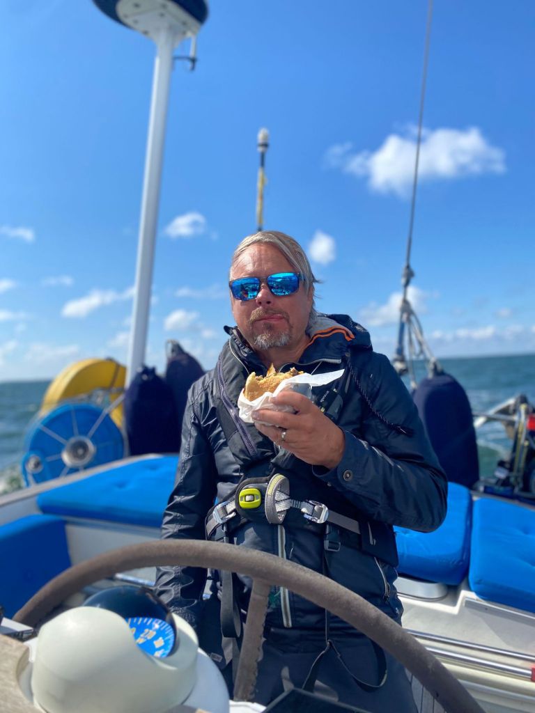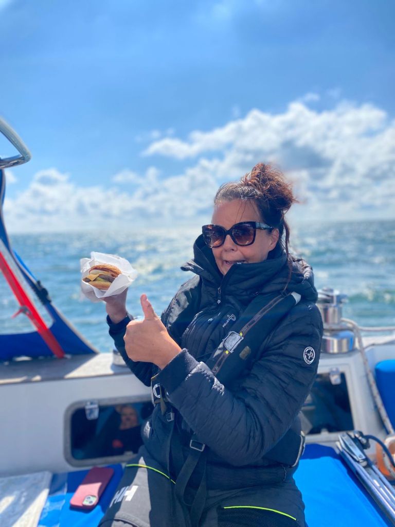 Runsaan 50 meripeninkulman matka taittui kahdeksassa tunnissa kevyesti. Merellä riitti vilinää: saimme sivuuttaa rahtilaivoja ja pujotella muiden veneilijöiden lomassa. Matkalla nautittiin hamppareita – sopiva lounas illan barbecue-juhlia odotettaessa