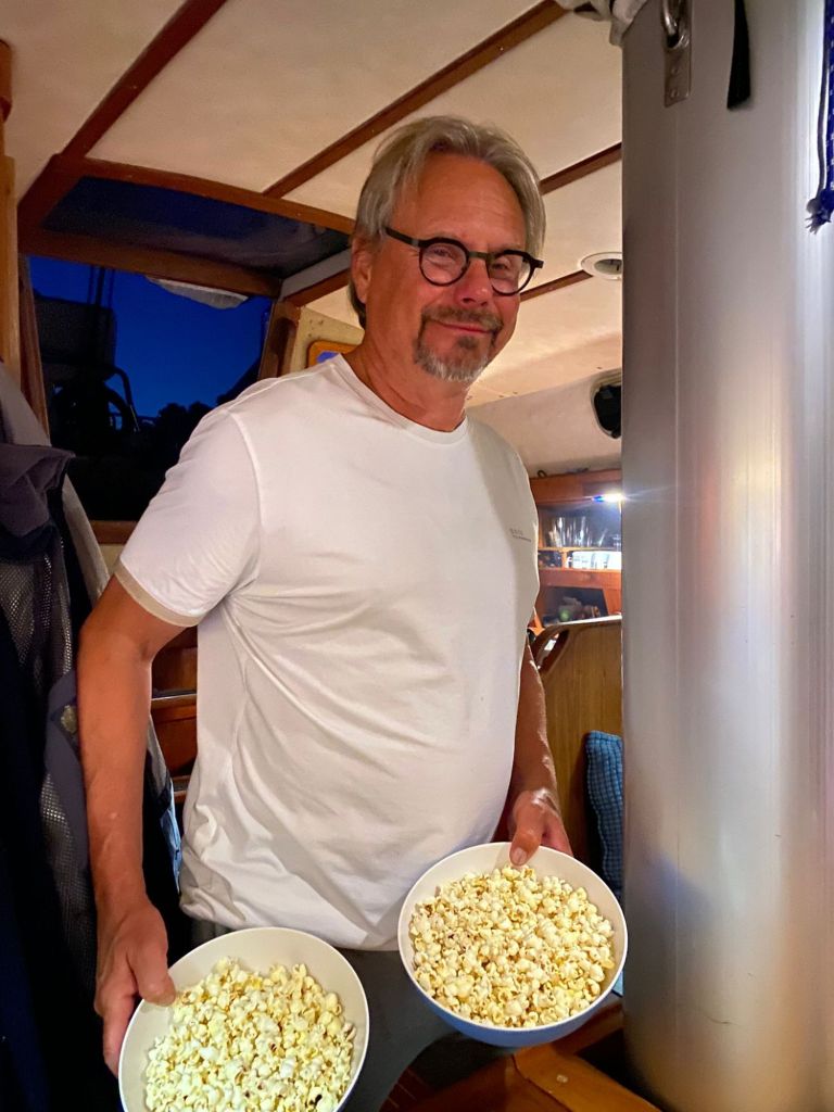 Illalla vielä leffaa ja popcorneja veneessä.