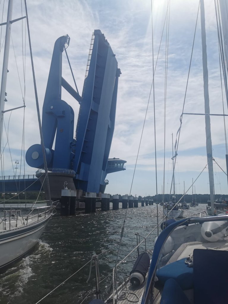 Helteisenä maanantaina lähdimme Panameerasta Simihunkkaan eli Peenemundestä kohti Świnoujściea. Olimme päättäneet kokeilla reittiä sisämeren kautta, vaikka syväydet siellä hiukan mietityttivätkin. Peenemundessa naapurinamme olevat ruotsalaiset olivat samoissa aikeissa. Ajoissa siis Peenestromia kohti Wolgastin siltaa. Ajoimme vastatuulessa ja kevyessä virrassa alas sillalle. Matkalla oli joitakin pikku kyliä, muuten näkymänä maalaismaisema, lehmiä unohtamatta. Sillan aukeaminen tapahtuu neljästi päivässä ja odotetusti tässä 12:45 avauksessa oli paljon menijöitä sekä tulijoita.