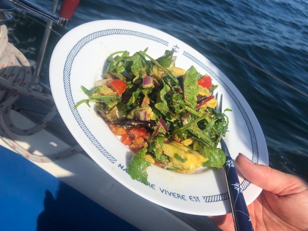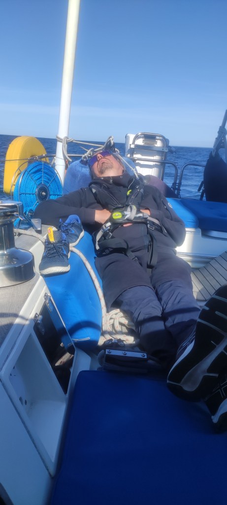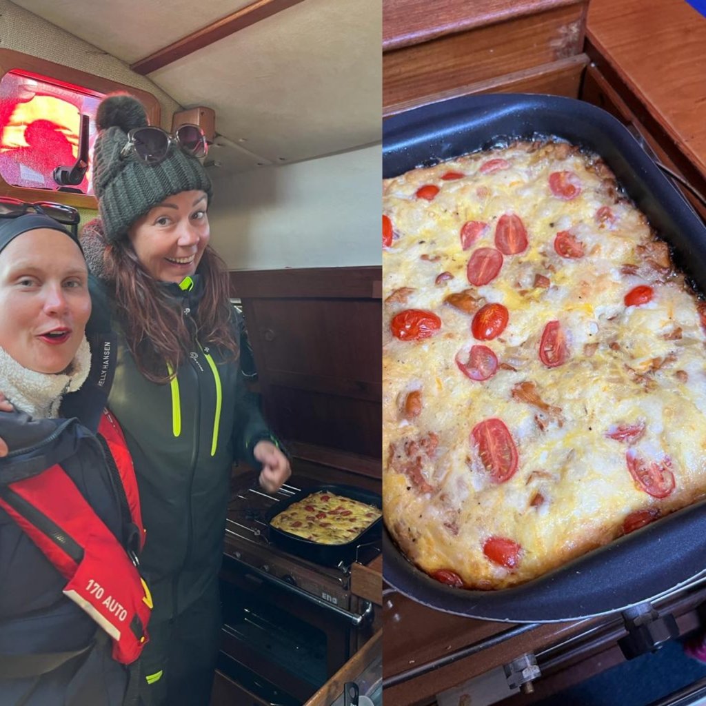 Merellä meno oli makoisaa, vene kulki kevyen tuntuisesti. Lounasta vielä keikkuvasta pentrystä, mutta päivän aikana mainingit laantuivat. Iltapäiväkahvilla Petri sai nauttia hillomunkista, josta oli haaveillut pitkällä avomeri osuudella. Illan vei eteenpäin Lombardini, SMHI:n tuulitiedoista löytyi tälle hyvä selitys😂.