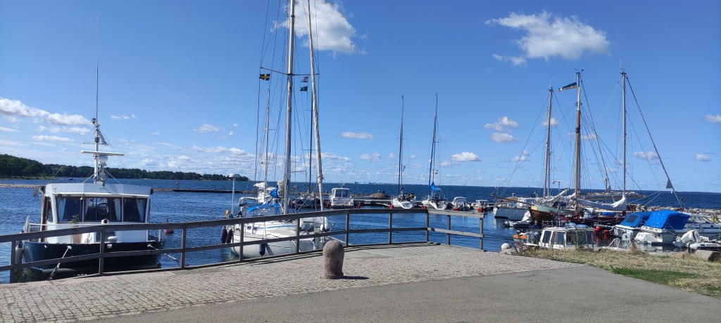 Saavuimme satamaan kehnosti varustautuneena ja saimmekin hetken puuhastella melko hektisesti, jotta Selena kiinnittyi laituriin. Satamassa on erinomainen servicehus, jonka tunnukset saa Swish- maksulla. Kun meillä ei ollut tuollaista sovellusta saapui satamakapteeni ystävällisesti paikalle soittamalla. Rantaravintola todellakin korkeatasoinen ja olimmekin paikalla outolintuja tuulitukkiemme kanssa. Ruokailu jäi kyllä kokeilematta, koska ensimmäisen 20 minuutin aikana olimme lukuisille tarjoilijoille kuin ilmaa. Onneksi huomasimme samaa kohtelua saavan muidenkin saapujien. Syy ei ollut siis pelkästään hiuslookissamme ja vaatevalinnoissa. Venekeittiöstä valmistui onneksi lämpimiä voileipiä, ihan maukkaita, mutta ei tietysti mitään a la carte – tasoa.