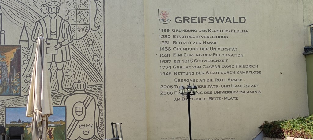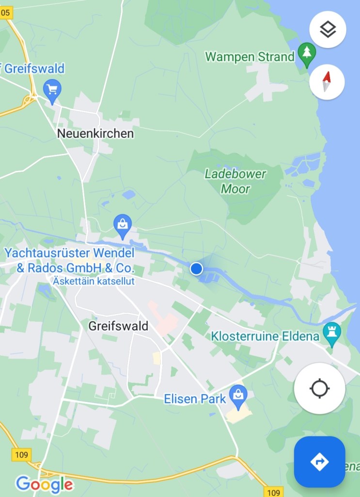 Päätimme mennä perille Greifwaldiin asti, vaikka joen alkujuoksulla on Weikin kelpo satama. Tämä tarkoitti konetusta kapeassa rännissä 40 minuutin ajan. Klappisilta aukeaa tasatunnein eli saimme hetken sitä odotella. Greifwaldissa erinomainen paikka sataman aisapaikasta. Hyvä satama ja kaikki palvelut perustuivat satamakorttiin, jonka sai sataman maksuautomaatista maksamisen yhteydessä. Satamamaksu 27€/yö ja suihku 1€/5min. Suihkuraha ladattiin satamakorttiin eli pientä kortinvaihto suunnittelua vaati tällaiselta samanaikaisesti toimivalta parilta. Lähtiessä satamakortin pantin ja käyttämättömän rahan palautus kävi myös kätevästi automaatilla – varsin kätevää 👍