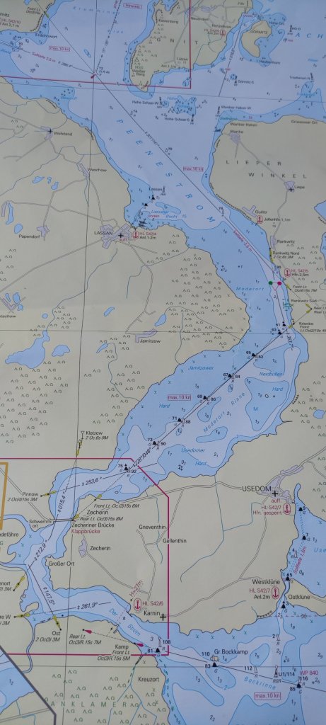 Wolgastissa sillan takana on iso telakka, jossa ylhäällä ainakin pari sota-alusta ja valmistumassa upea Monakon rannalle sopiva yksityisristeilijä. Wolgastin telakan jäätyä taakse alkoi Peenestrom, jossa odotetusti vedensyvyys oli matala. Tässä mutkassa konetimme usean veneen saattueessa ja me tietysti tarkasti väylällä. Saksalaiset oikoivat rohkeammin viittojen monilta puolilta ja tietysti seilasikin. Tuossa Ziemitzin sisäänajon kohdalla oli koko kanavan matkan matalin kohta, meidän kaiku näytti alimmillaan 1,5m (anturi veneen rungon alla). Mitään tössähdystä emme tunteneet mutta kaasu kyllä keveni, saksalaisten kiristäessä purjeita ja luoviessa vauhdilla ulos. Näppärästi seilasivat matalien reunoja hioen. Meiltä vaati jo tarpeeksi näppäryyttä pysyä väylällä. Yhtä matkaa meidän kanssa lähtenyt ruotsalainen kokenut veneilijä Hallberg Rassy 36:lla (syväys 1,75), kertoi heidän tössähtäneen tuossa kevyesti. Mielestäni hänkin ajoi kyllä hiukan reippaammin väylän reunaa, itse kun pysyin ihan keskellä😯. Lähes koko siltojen välisen matkan kaiussa oli alle 2 metrin lukuja, luksusta oli kun näytti 2,2m. Selenan syväys siis on 2m ja joskus olen miettinyt, että olisiko 2,05 lähempänä totuutta, ainakin hyvin bunkrattuna👍.