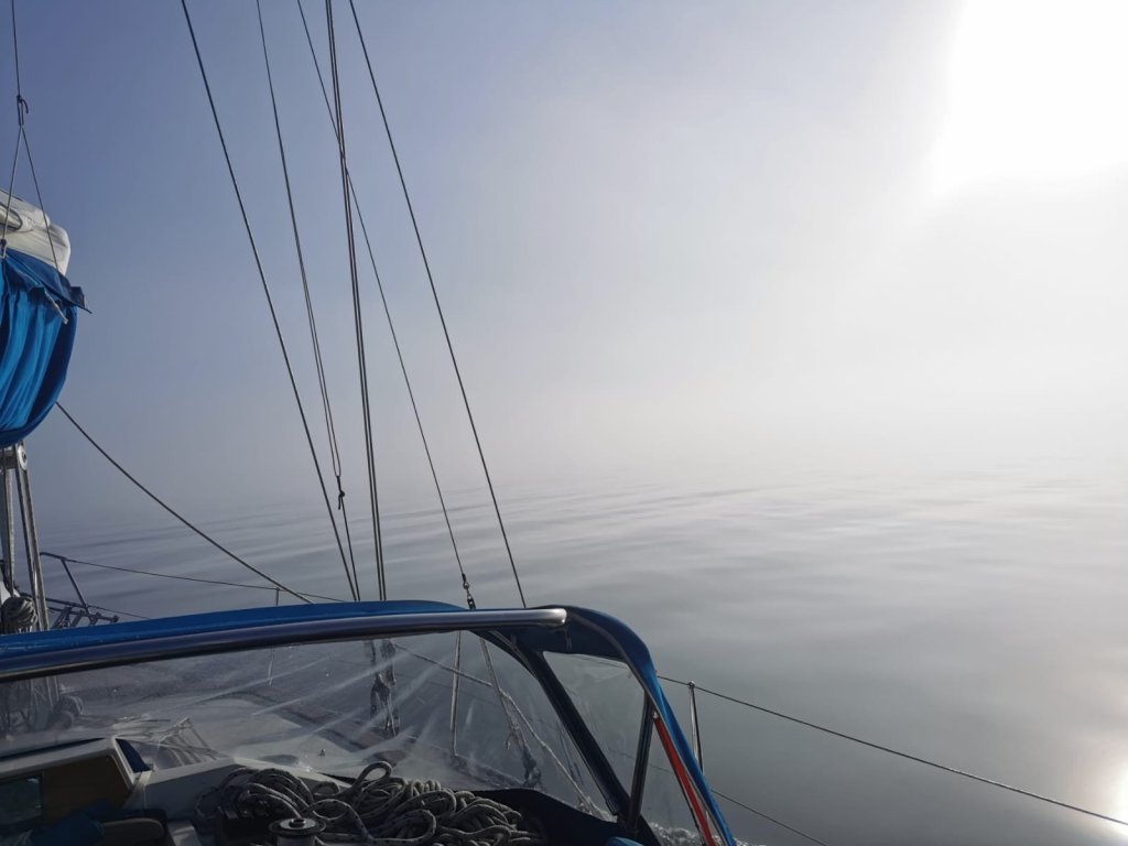 Aamun valkeneminen tarkoittaa vahdin vaihtumista. Yö laski lämmöt taas pitkälti alle kahden kympin ja en ihmettele, että sängystä kannelle kivunnut kaipasi Valtran toppahaalareita. Aamuyön vahdissa Petri pääsi sumuiseen maisemaan.