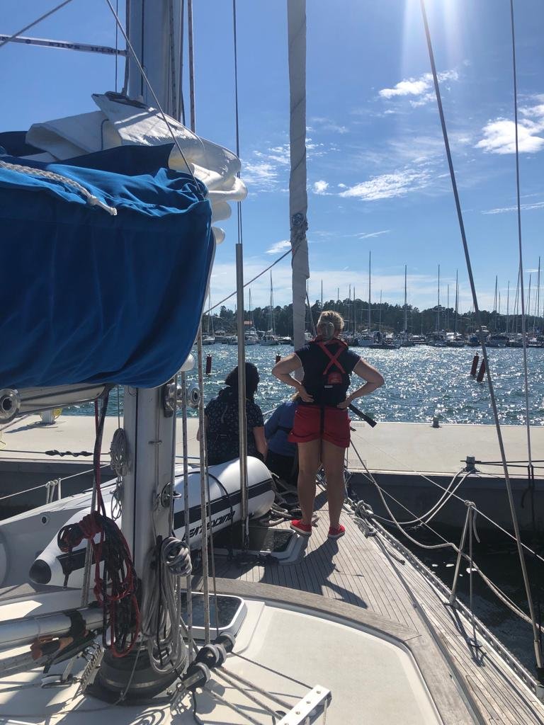 Merellä oli tuuli puhalsi perän takaa ja pääsimme täysin purjein reippaasti kohti Saltsjöbadenia. Jiipit tulivat tutuksi ja niissä riitti vauhtia ja jännitystä, varsinkin kun tuuli nousi ajoittain jopa 15m/s. Näimme Dalaron linnan ja ihastelimme rantojen ”kesämökkejä”. Meilläkin riitti seurattavaa ja hämmästelimmekin erästä saunalauttaa, joka lopulta paljastui kyljellään olevaksi katamaraaniksi. Melkein sama juttu siis!