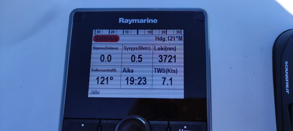 Puolen päivän aikaan pääsimme maininkiselle merelle missä odotettavissa oli mukavaa sivutuulta. Lähdön jälkeen saatiin kuitenkin heti tilanne päälle ja Petri pääsi aaltojen pesemäksi keikkuvalle kannelle. Onnistuneen purjeen noston jälkeen irtosi purjeen alaliikki mastokulmasta. Sakkeli oli irronnut, tallella, mutta kierteet sökönä. Nopeasti löytyneet kaksi sakkelia eivät passanneet tilalle, joten päätimme ajaa takaisin satama-altaaseen lisäetsintöjä varten. Tyvenessä löysimme lopulta sopivan sakkelin, joka sopi paikoilleen. Mietin käyttääkö muut sakkeleissa kierreliimaa vai millä ne pysyy kiinni. Herätimme selvästikin huomiota sillä paikalle tuli satamatoimiston kumivene ja merivartiosto. Ensimmäiselle riitti selitys tilanteesta, mutta toinen halusi myös puhalluksen alkometriin. Tunti siinä sitten meni jumpatessa ja sitten kokka kohti Öölantia👍