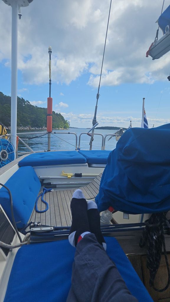 Sunnuntain kunniaksi hidas aamu, meillä ei ollut kiire koska menemme vain runsaan kymmenen mailin päähän Utklippanille. Petri teki töitä ja minä siivosin istumalaatikkoa. Lattia ritilän alle kehittyy kyllä melkoinen hiekkalaatikko hetkessä ja siihen kun yhdistyy nippu hiuksia, jokunen pala paperia jne on tyhjennysputkien aukot kovilla. Sitten merelle ⛵. Harvoin kesälomalla seuraava kohde on lähes näkyvissä kun edellisestä ehtii ulos. Tänään oli niin.