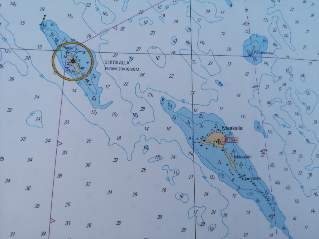 Raahesta lähdettyämme pääsimme purjehtimaan. Luovimme 9-13 m/s lounaistuulella kohti lounasta. Melkoista sik-sak kuviota kertyi plotterin näytölle. Suuntana oli piskuinen ulkosaari Maakalla, Kalajoen edustalla. Illan tullen tuuli tyyntyi ja viimeiset kymmenen mailia oli Lombardin hommia.