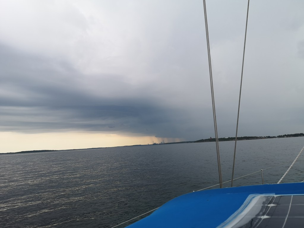Keskiviikko aamu herätti sateen ropinalla ja tuulen viuhunalla. Nyt ei tehnyt mieli herätä. Odottelimme yli puolen päivän pahimpien sateiden ohittumista ja sitten suuntasimme tuuliselle avomerelle. Piukkaa kurssia ja melkoista keinutusta oli tarjolla. Teinitkin littyivät seuraamme ulos, sillä kannen ala oli kyllä nyt epämukavaa. Kalojakin ruokittiin. Iltaa kohden tuuli tyyntyi ja viimeisen tunnin ajoimme koneella, isopurje ylhäällä saaden siitä mukavaa tasapainoitusta keinutukseen.