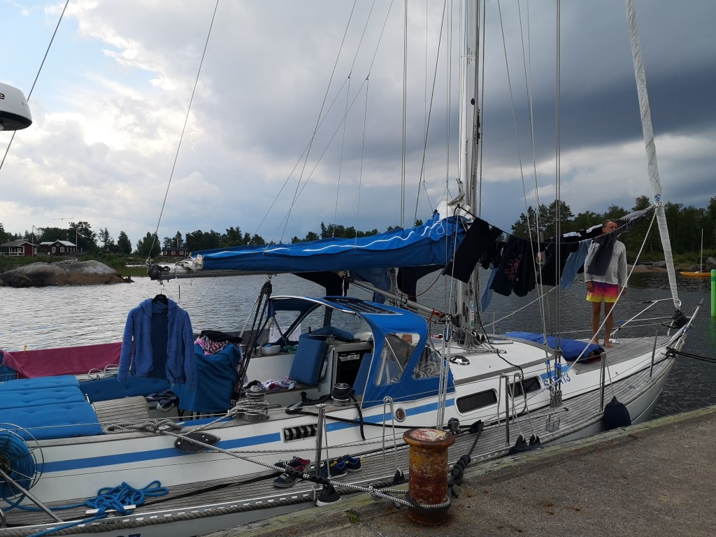 Iltapäivän aikana taivas harmaantui ja alkoi sataa, sitä ripottelua riitti sitten koko maanantai-illaksi. Onneksi rannan läheisyydessä sijaitsi S-Market josta saimme kaiken tarvitsemamme ja teinien avulla kantaminenkin sujui kuin tanssi. Huomenna aamulla merelle ja suuntana etelä… Olisipa kiva tietää onko meillä tuulta ennusteen mukaisesti max 12m/s vai jotain aivan muuta – vahva veikkaus, että jotain aivan muuta!