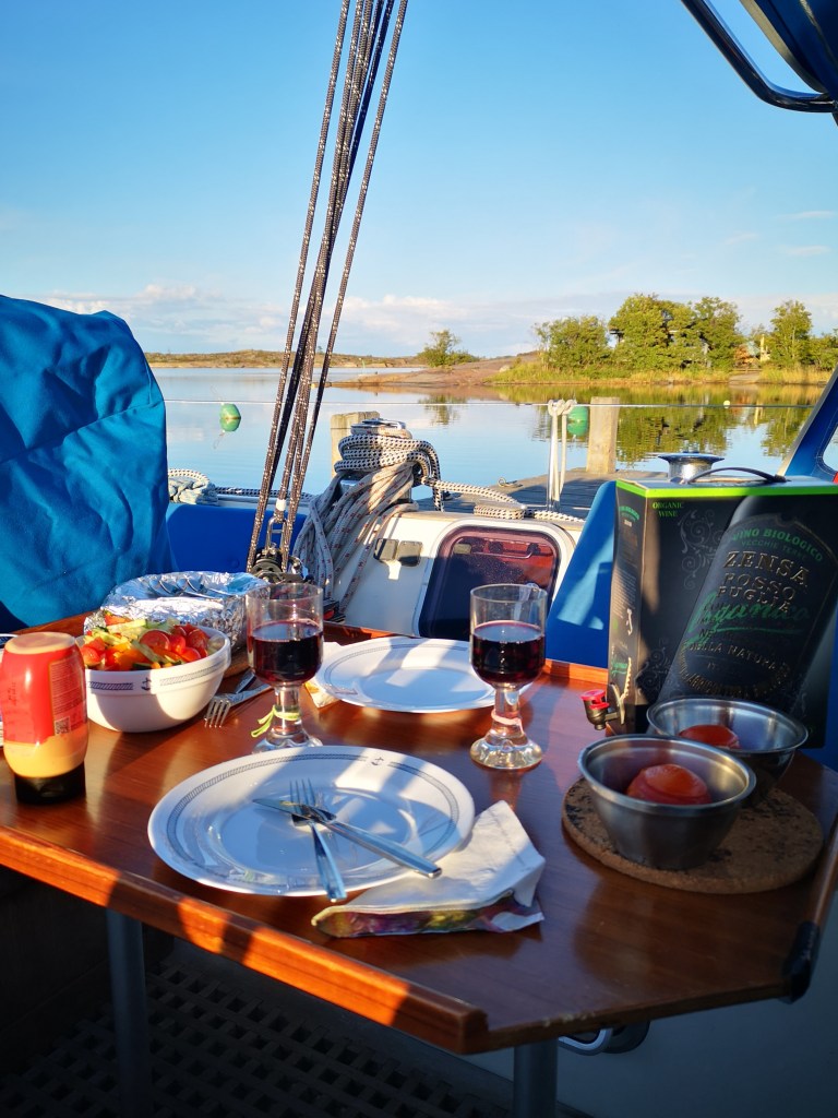 Tässä syyskuussa on ollut myös toisenlaista keliä. Kaksi viikkoa sitten meille tarjottiin sadetta ja uhkaa 15-20 m/s puhaltavasta länsituulesta. Silloinkin tietysti merellä, mutta melko vaatimattomin suunnitelmin. Härjänmaankari ja Nauvo olivat siihen sopivat targetit. Aamulla Härjänmaalla keinutti kuin kehdossa, kun aallot kiersivät myös suojan puolelle. Vinhaa vauhtia kiisimme kohti Nauvon aisaa, sumpuraisessa säässä ja puuskaisessa tuulessa. Nauvossa keula kohti länttä kelpasi odotella isompia tuulia. Lopulta L’Escalen terassilla iltaa istuessa ei sateen ropina edes latistanut tunnelmaa, vaan oikeastaan saatiin vain hyvää nousua Selenan diskoon. Hyvä palvelu ja erinomainen ruoka – saa aina pisteet kotiin tuo L’Escale. Onnistuin myös tummentamaan ruokalistaa, kävi muuten hämmentävän näpsäkästi. Tarjoilijan ilmeestä päättelin etten ollut ensimmäinen.