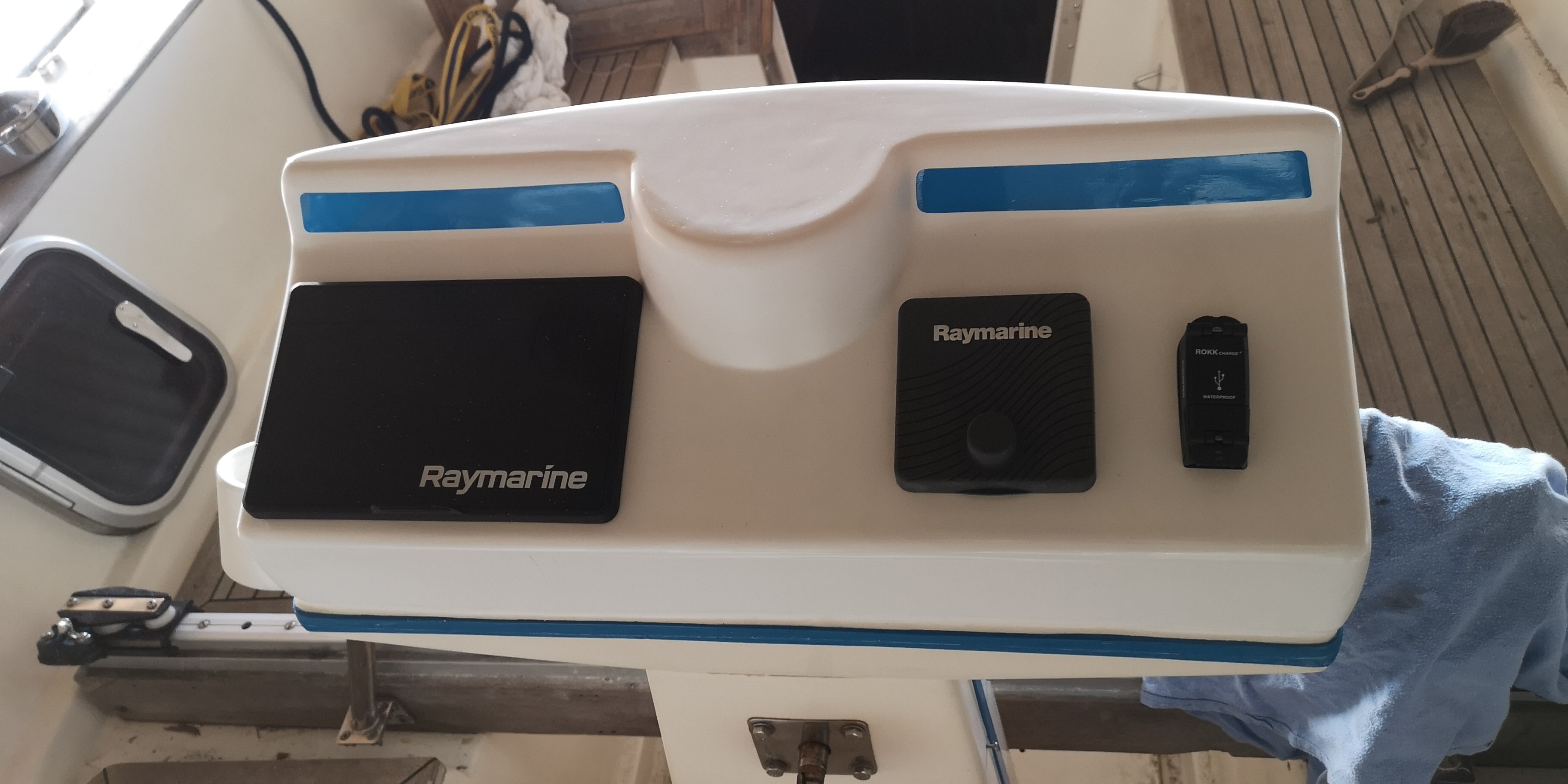 Ihan samalla sitten maalasin mustat vauhtiraidat sinisiksi ja siloitin pedestaalin sisäosan. Sileään siniseen on sitten kiva tyontää tarvittaessa käsi, uudesta manusluukusta. Paikalleen istuttaminenkaan ei mennyt ihan niin mutkattomasti kuin olin ajatellut, mutta pienten lisätukien laminoimisella tulos oli parempi kuin vanha. Nyt tulos on hyvä ja ennenkaikkea käytännöllinen. Vielä puuttuu kompassi toimitusvirheen vuoksi ja muutamat tiikkirimat…