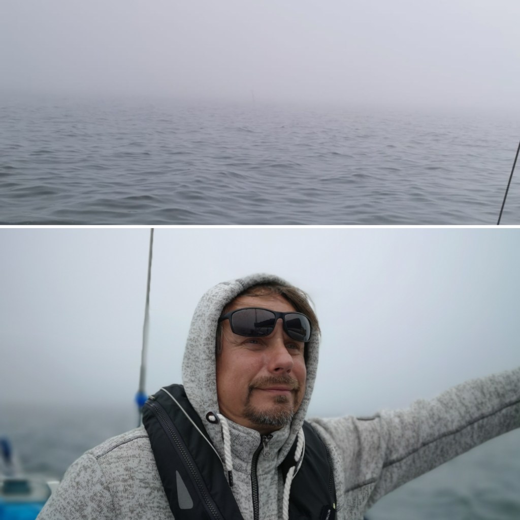 Ensimmäiset pari tuntia konetettiin tyynessä, mutta tuuli virisi juuri kuten ennustettu. NNW tuuli sopi meille hyvin. Harmi vain, että myös harmaa sumu laskeutui kaiken ylle.
